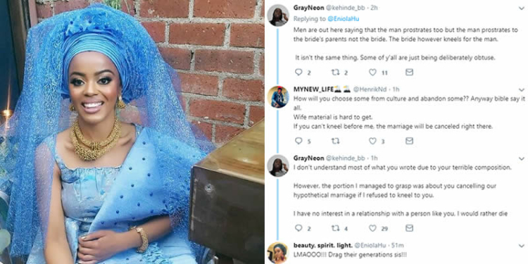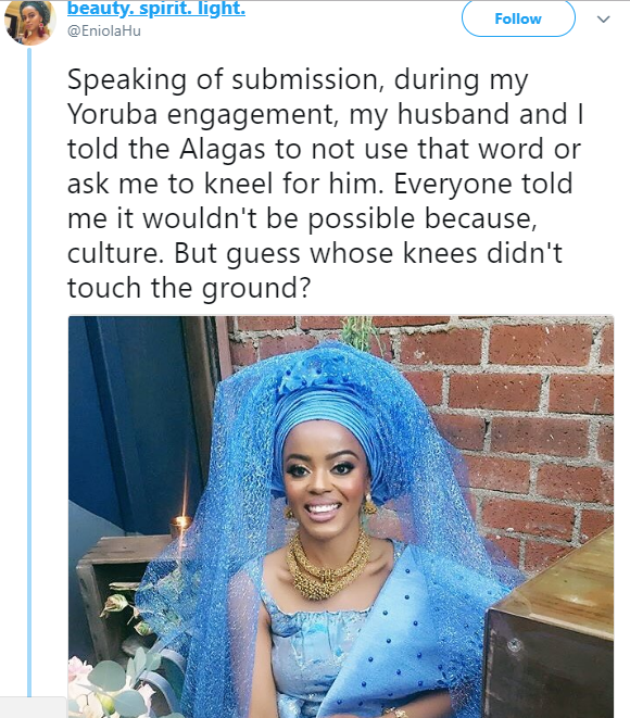 Eniola said the decision to kneel was reached by her and her husband. Her husband’s family also ddn’t have a problem with it. She especially had the support of her sister-in-law not to kneel. But Twitter users, mostly men, took up the case and bashed her for not respecting the culture.