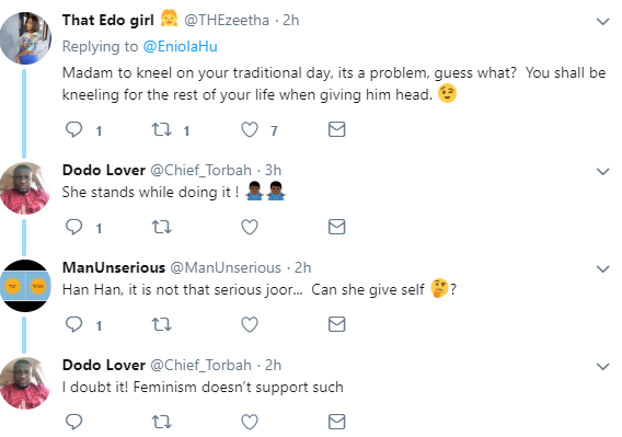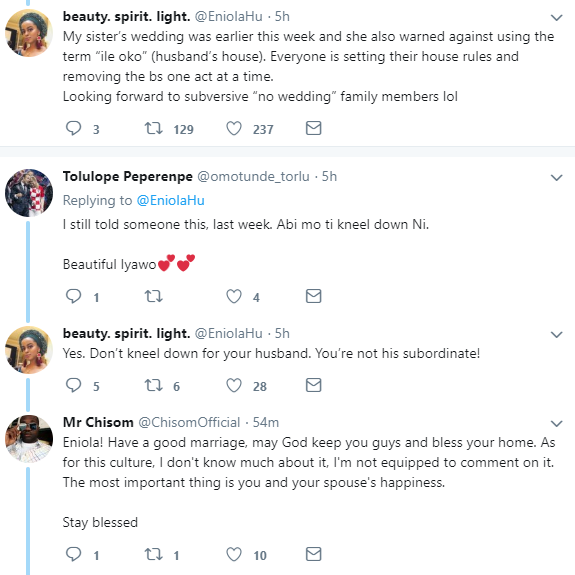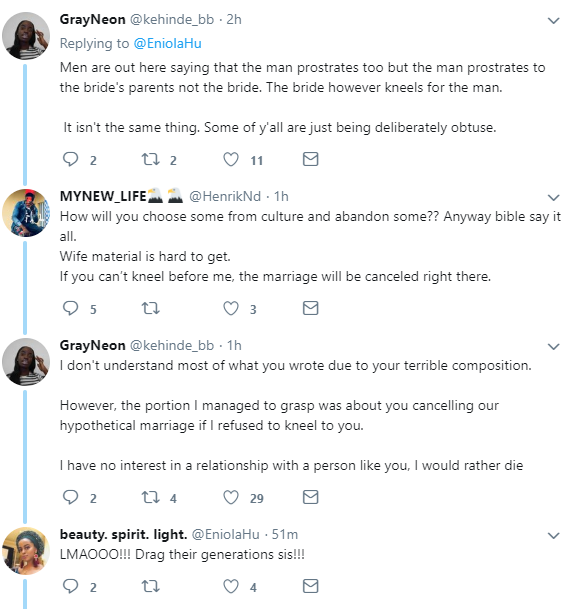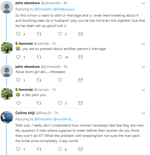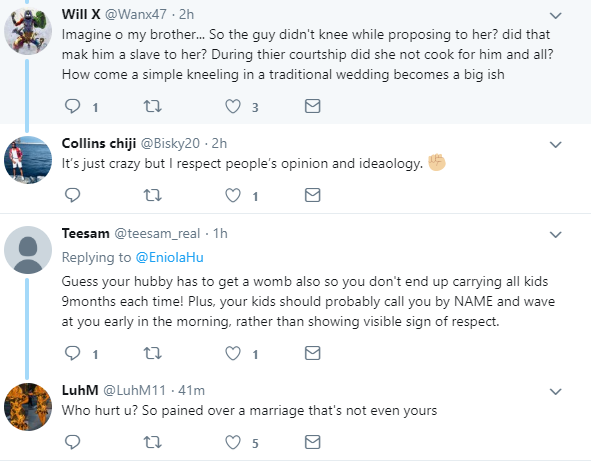 Eniola said the decision to kneel was reached by her and her husband. Her husband’s family also ddn’t have a problem with it. She especially had the support of her sister-in-law not to kneel. But Twitter users, mostly men, took up the case and bashed her for not respecting the culture.