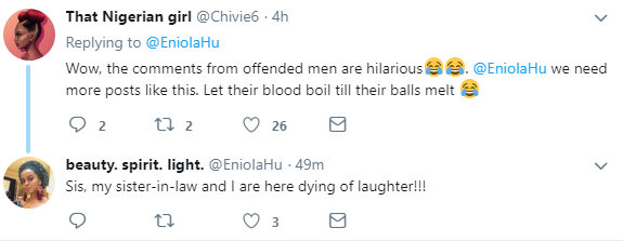 After she shared her story, some women who did the same thing came to share theirs. A few Nigerian men applauded her for challenging the status quo. But the majority of Nigerian men were angry and called her out. Some even insulted her husband for supporting her.