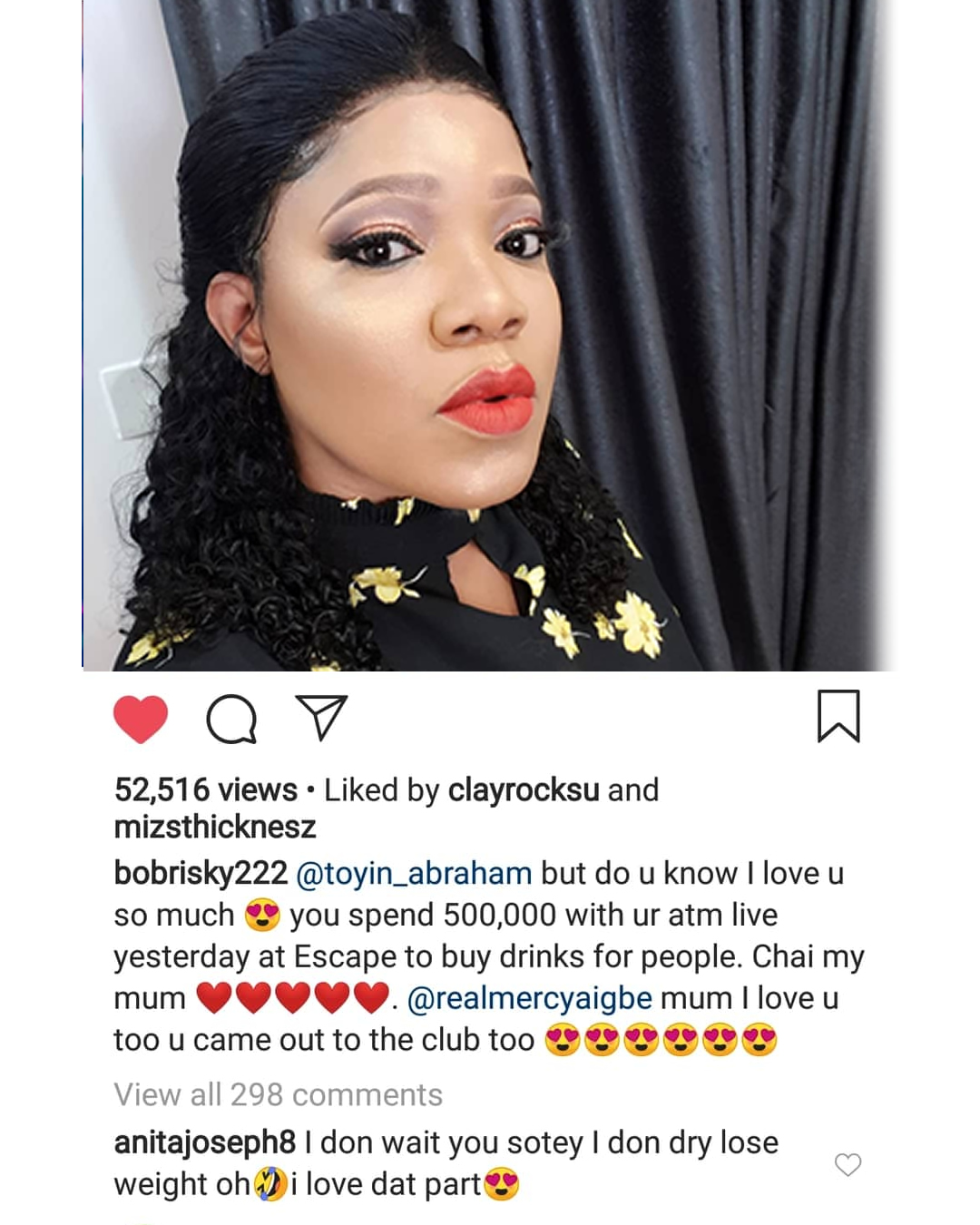 Bobrisky who made the post on his Instagram page wrote that the star actress spent a whooping N500, 000 on drinks at his after party in a nightclub.