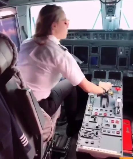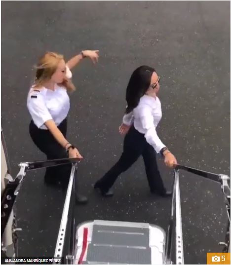 Alejandra Manriquez Pérez is filmed in the cockpit before jumping out onto the tarmac with her flight assistant.