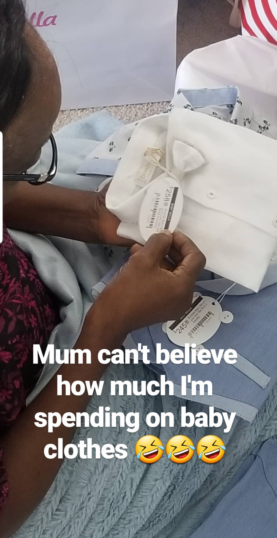 Taking to her Instagram story, she also shared photos of some of the designer clothes she’s already buying for her baby boy, to the surprise of her mum who can’t believe the extravagant cost of them.
