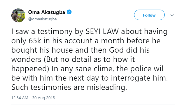“I saw a testimony by SEYI LAW about having only 65k in his account a month before he bought his house and then God did his wonders (But no detail as to how it happened) In any sane clime, the police wil be with him the next day to interrogate him. Such testimonies are misleading.”