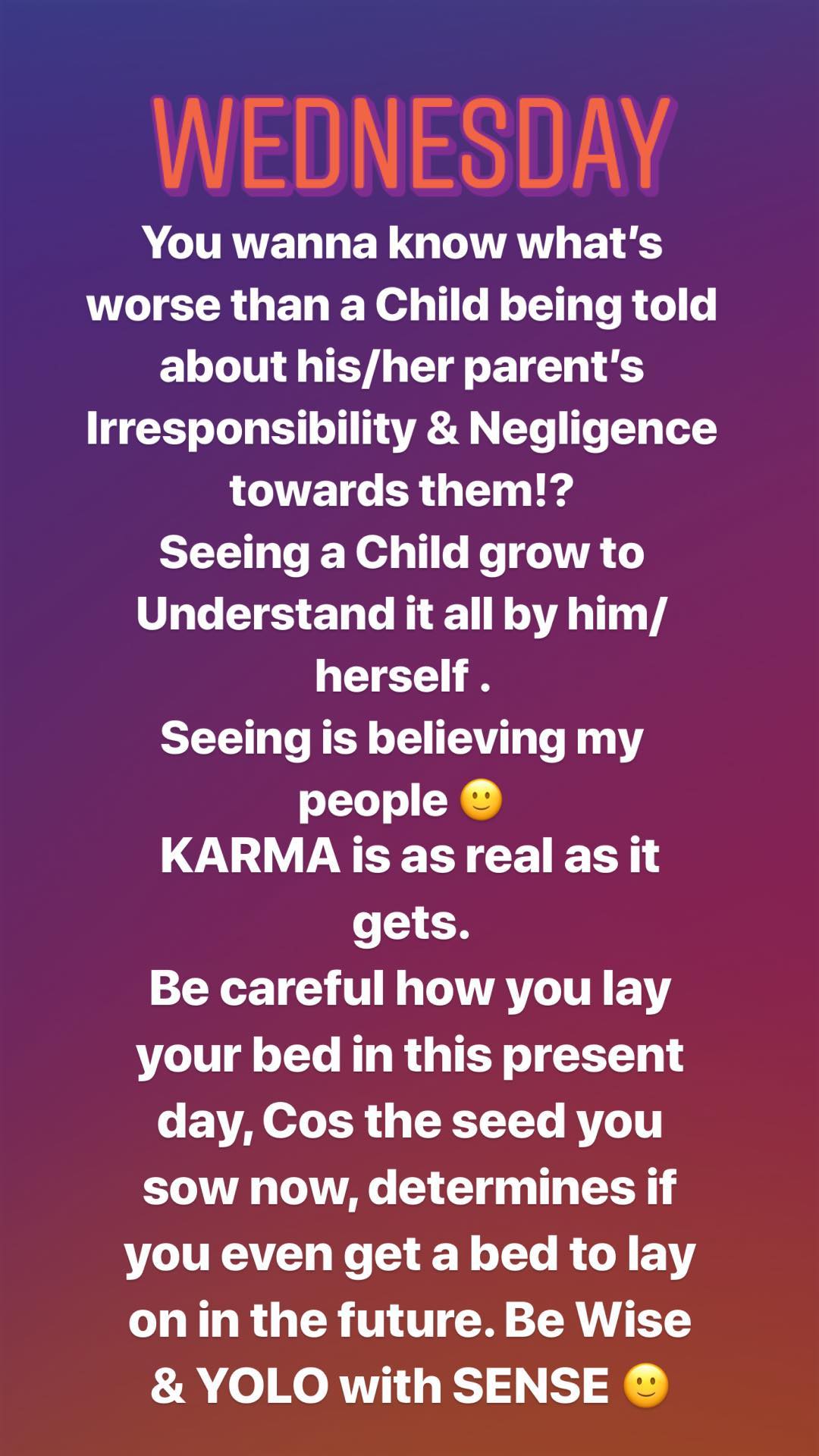 Seeing is believing my people. KARMA is as real as it gets. Be careful how you lay your bed in this present day, cos the seed you sow now, determines if you ever get a bed to lay on in the future. Be wise and YOLO with sense,” she wrote.