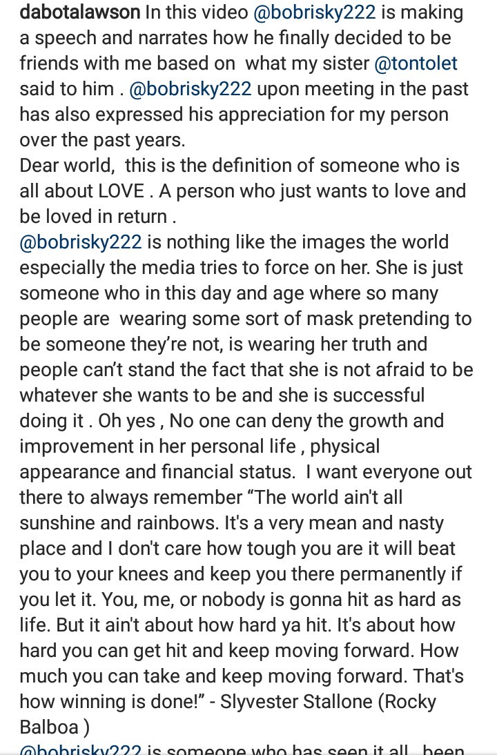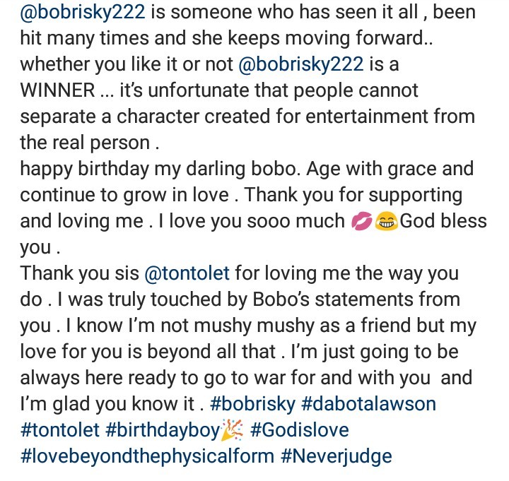 Former beauty queen, Dabota Lawson referred to Bobrisky in the feminine form as she celebrated him on his birthday with beautiful words.