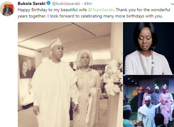 ”Happy Birthday to my beautiful wife @ToyinSaraki. Thank you for the wonderful years together. I look forward to celebrating many more birthdays with you”.