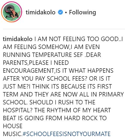 Singer, Timi Dakolo took to his Instagram page recently to make a rather hilarious post, explaining that he has “fallen sick” after he paid his children’s school fees.