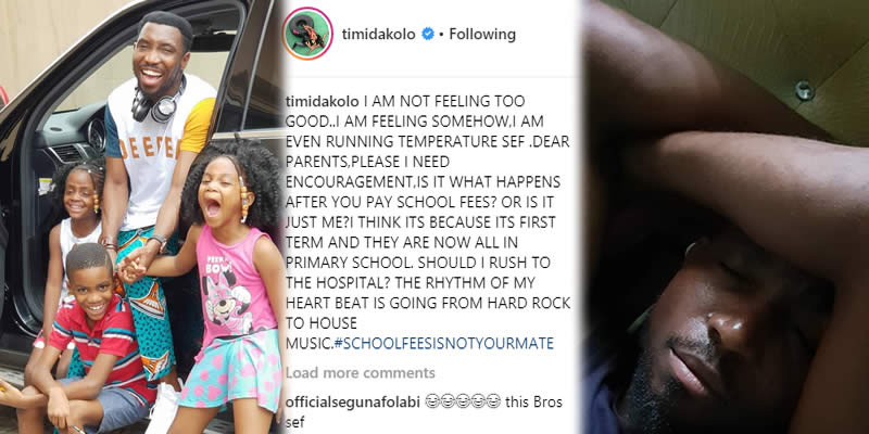 Singer, Timi Dakolo took to his Instagram page recently to make a rather hilarious post, explaining that he has “fallen sick” after he paid his children’s school fees.