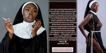 “In any case reverend sisers and fathers smoke in real life which has not been established as sin to my knowledge. Dear Nigerians I don’t do what I do for applause .. If this images came out from a movie, will it be ok? It’s funny how you all just sinned because of a beautiful artistic picture : lol I laugh in Hebrew… MATTHEW 7:1-5 … #BEVERLYSAYS”