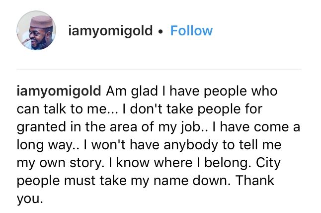 “Am glad I have people who can talk to me… I don’t take people for granted in the area of my job.. I have come a long way.. I won’t have anybody to tell me my own story. I know where I belong. City people must take my name down. Thank you.”