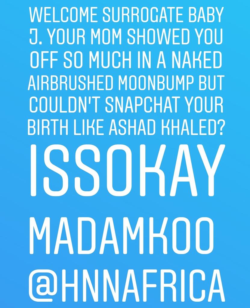 Kemi wonders why Linda, who could bug fans on social media with baby bump pictures, now shied away from filming the baby delivery process just as DJ Khaled did with his son Ashad.