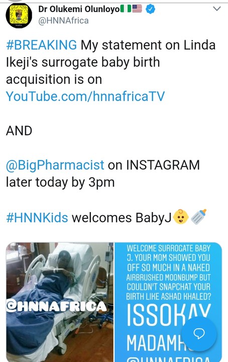 The new mother in town, Linda Ikeji shared the photos her new born and not everybody was happy with the news, one of such is controversial blogger, Kemi Olunloyo who slammed her again with claims that her son Baby J whom she just welcomed in Atlanta is a surrogate baby.