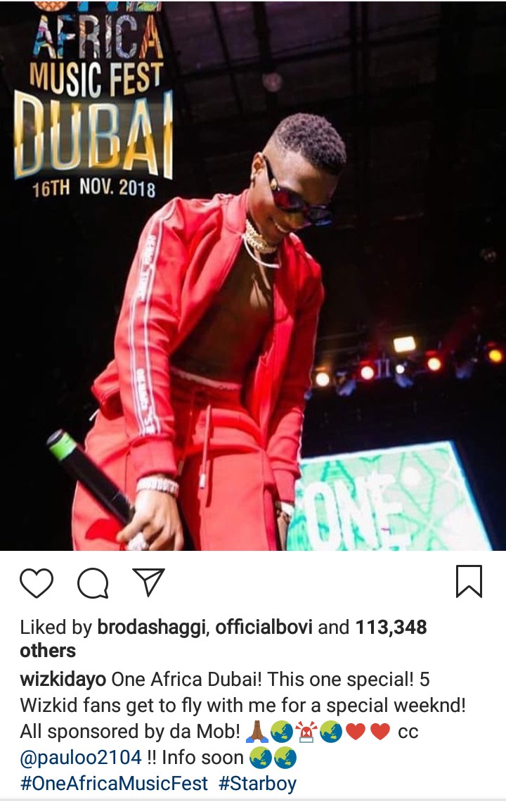 “One Africa Dubai! This one special! 5 Wizkid fans get to fly with me for a special weeknd! All sponsored by da Mob!”