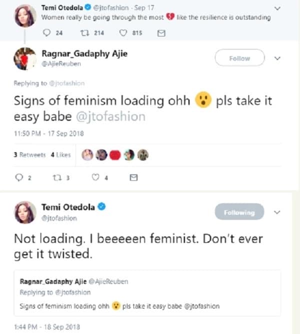 One of which is Nigerian billionaire Femi Otedola’s daughter, Temi Otedola. She has taken to social media to reveal that she is indeed a feminist. She made this known on Twitter after a follower reacted to her tweet about women going through the most.