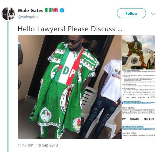 Wale Gates shared a photo of Davido in his NYSC uniform and another of him in a PDP uniform and added a screenshot of the NYSC rule being flouted by the popular singer. He then invited lawyers to discuss it.