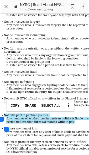 According to the NYSC rules and regulations, serving corps members are not allowed to take part in partisan politics. Doing so attracts a penalty of 3 months without pay.