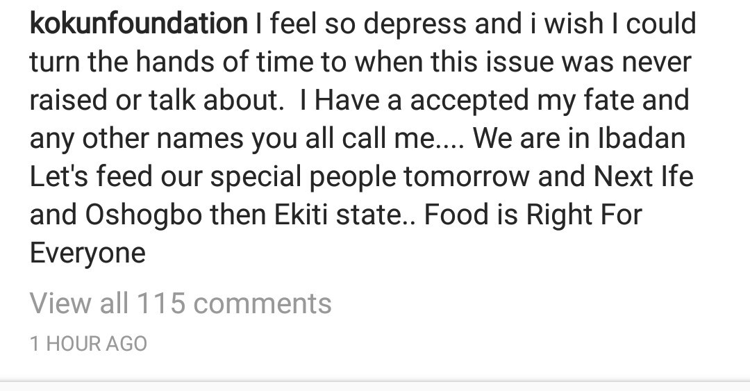 Kokun foundation is an NGO and a good portion of what is being given out as charity usually comes from people’s donation (Rich Residents, Celebrities, and other cheerful givers). It is possible the feud made a lot of people to lose trust in Kokun which is obvious in the above comments by his Fans, this might have resulted in declination of incoming donation to his Organization which is capable of breaking an NGO. It is also possible that this is the reason behind Kokun’s latest depression.