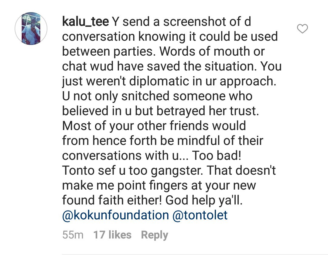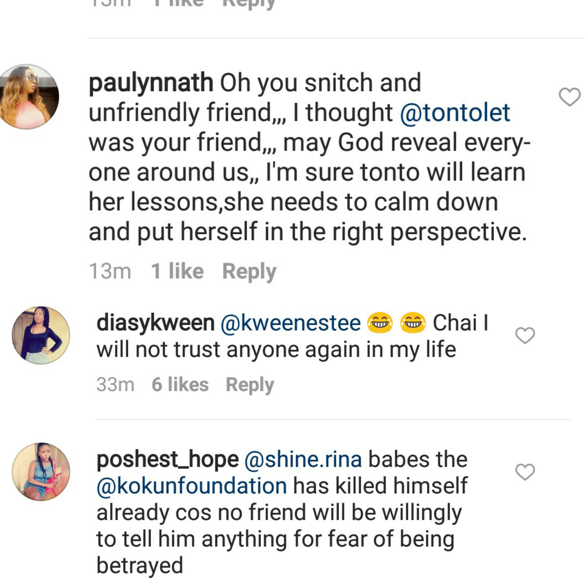 Tonto’s professed faith had subsequently been questioned while Kokun’s loyalty as a friend was questioned more.