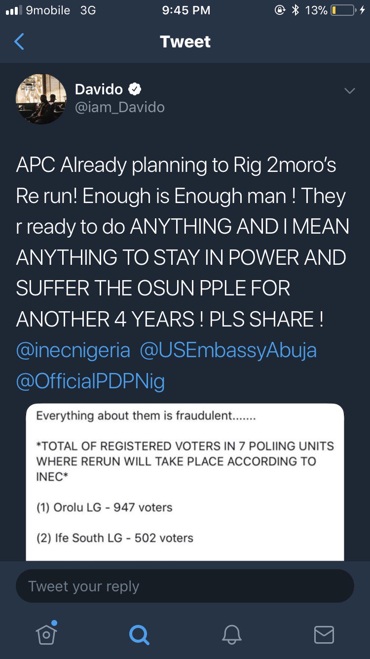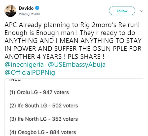 His tweet: “APC already planning to rig tomorrow’s re-run! Enough is Enough man! They’re ready to do anything and I mean anything to stay in power and suffer the Osun people for another 4 years! Please share! @inecnigeria @USEmbassyAbuja @OfficialPDPNig”