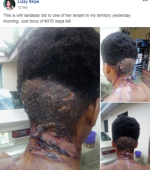 A landlady allegedly scalded her tenant over unpaid power bill. According to Lizzy Ekpe, the unpaid NEPA bill amounts to only 370 Naira. But the paltry sum did not stop the landlady from inflicting injury on the lady’s head and neck.