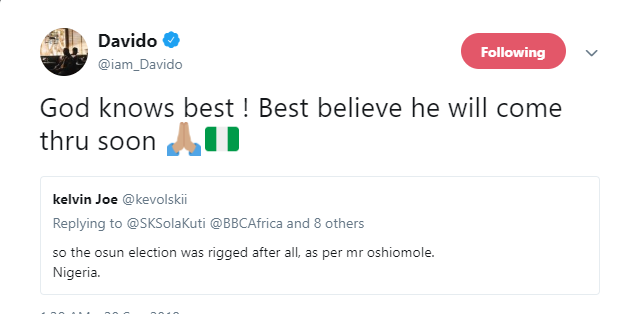 However, reacting, Davido who had on Thursday raised the alarm that PDP supporters were not allowed to vote in some LGs where the supplementary election took place and claimed that APC thugs were seen assaulting voters, said he has left the situation to God.