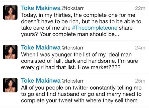 This morning on Twitter, Toke Makinwa spoke about her kind of man and she said, ‘my man doesn’t have to be rich, but he has to be able to take care of me’.