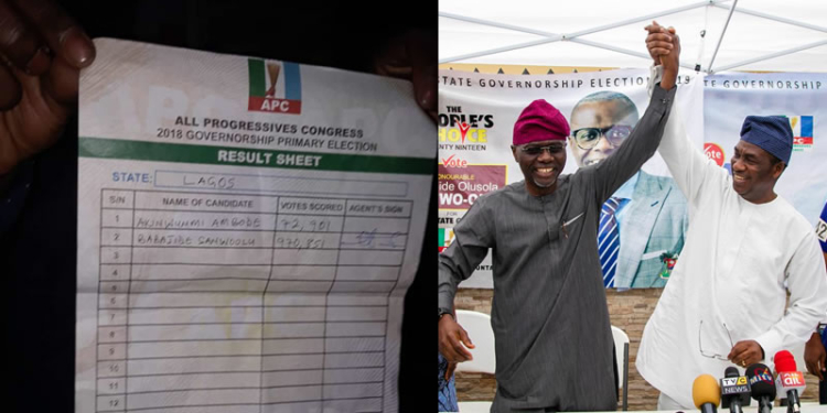 The result of the primary election was announced by the Lagos State Chairman of the APC, Tunde Balogun on Tuesday night and Jide Sanwo-Olu was declared the winner, with 970,851 votes while Governor Akinwunmi Ambode got 72,901 votes.