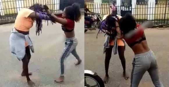 The young woman, dubbed a ‘slay queen’ across the internet in the now viral video, is seen dressed in an orange gown, with a grey sweater tied around her waist, while the supposed hairdresser was dressed in a charcoal grey sweatpants, stripped on the side with black lines and a red crop top, that revealed her black underwear.