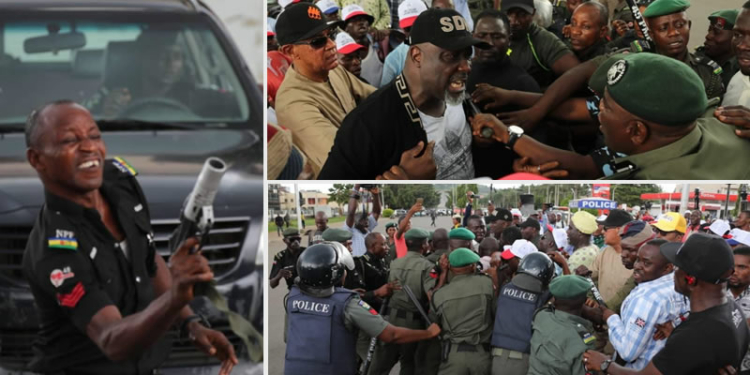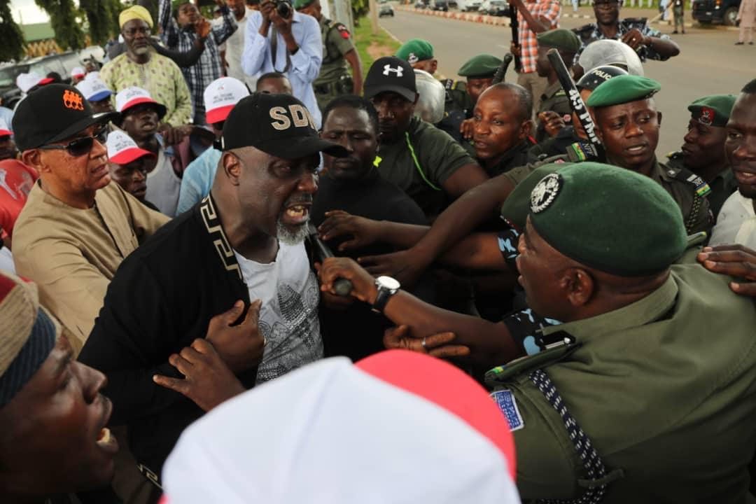 Photos: The moment Saraki, Dino Melaye, other PDP protesters were attacked at INEC office