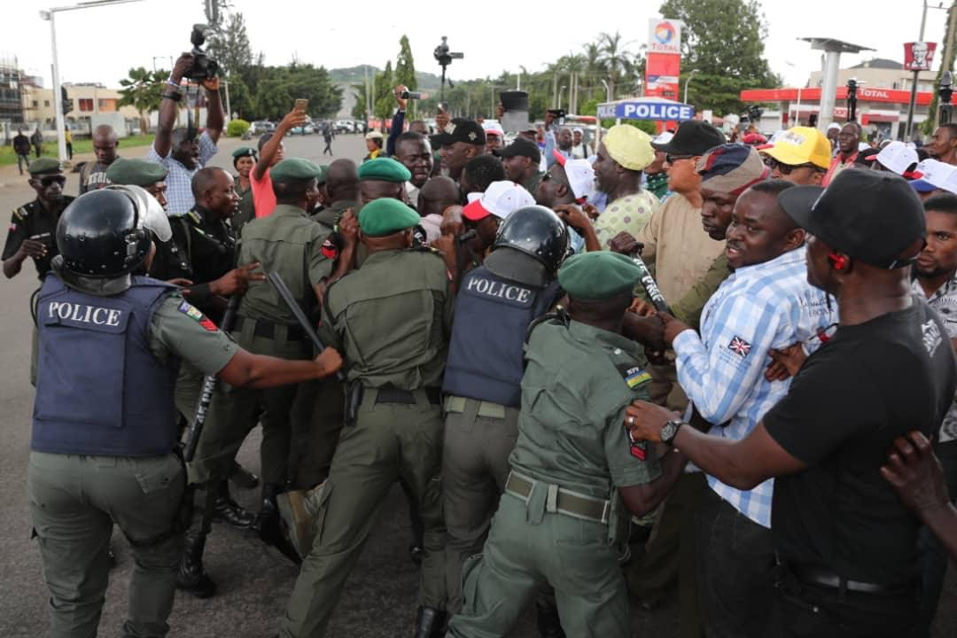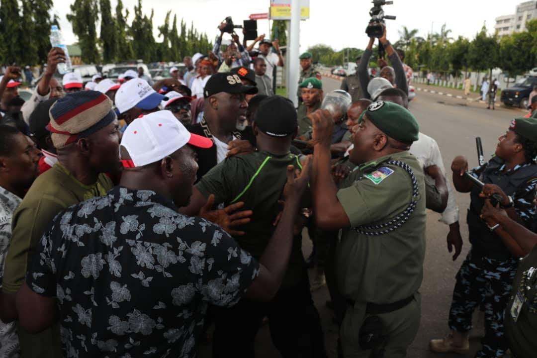 Pictures of the alleged attack carried out against the leaders of the Peoples Democratic Party, PDP against the outcome of the Osun State Governorship election at the headquarters of the Independent National Electoral Commission (INEC) in Abuja on Friday.