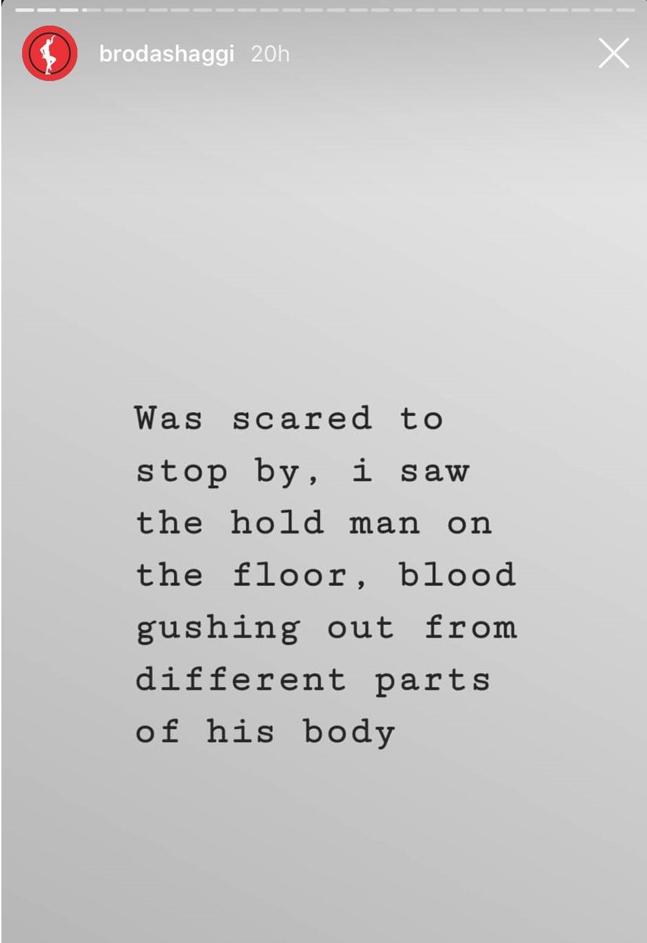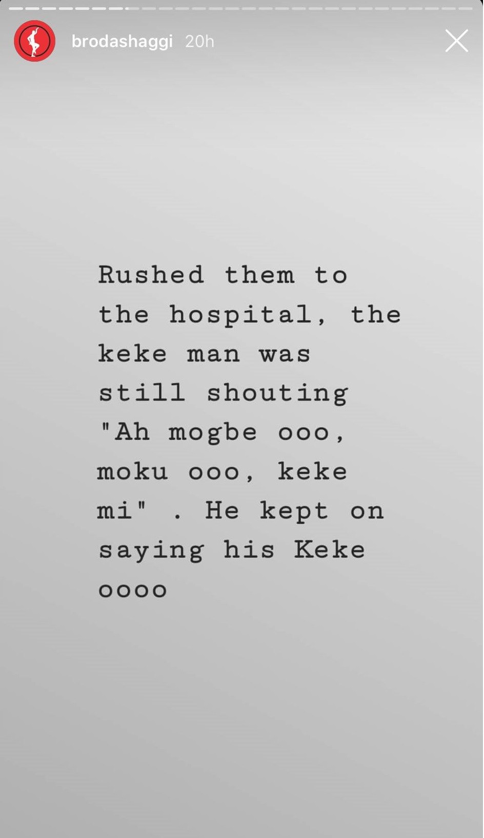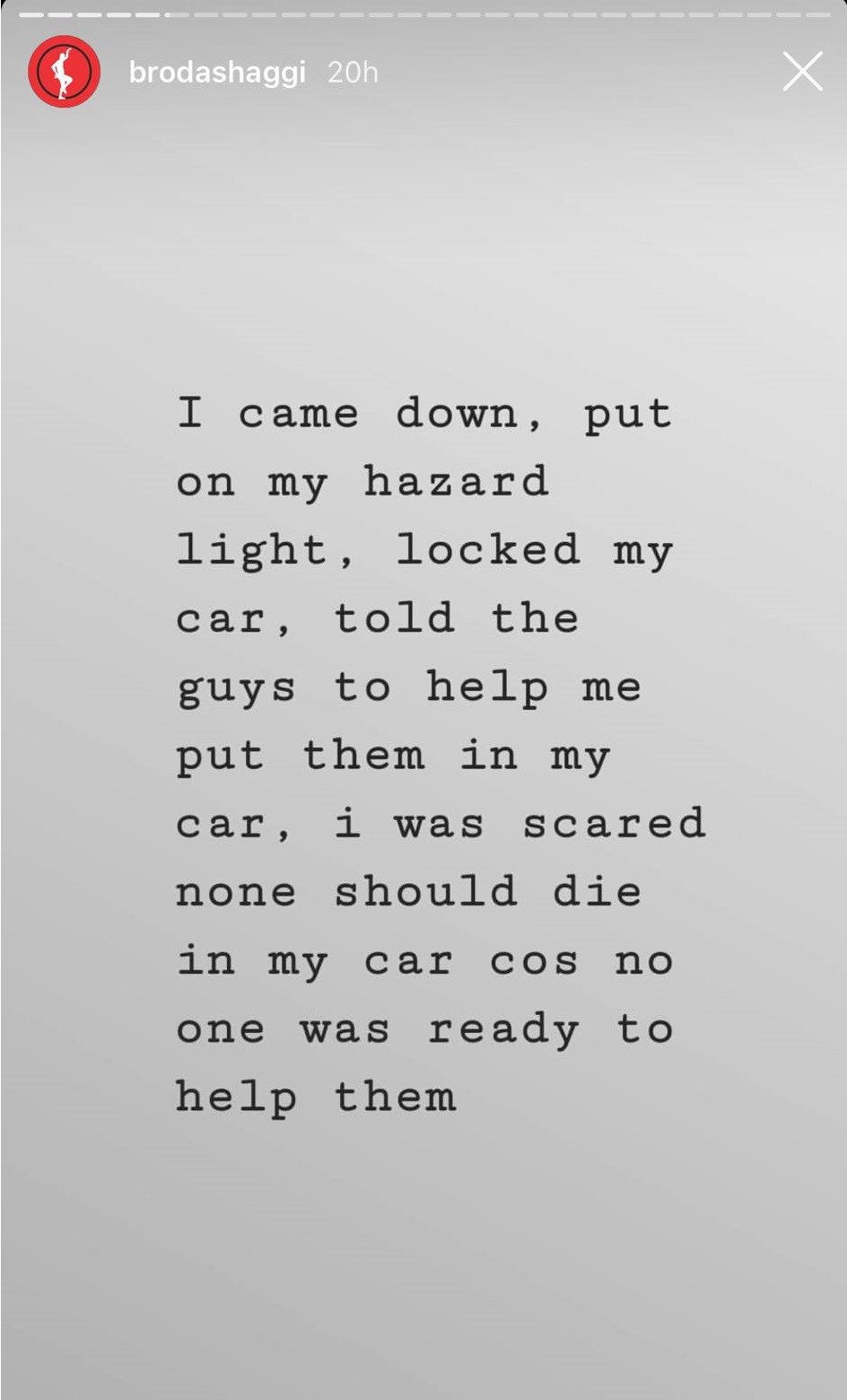 According to Broda Shaggi, he was scared at first to save the victims, but one of them, an old man was already loosing lot of blood, he had to take them both to a nearby hospital, to save their lives.