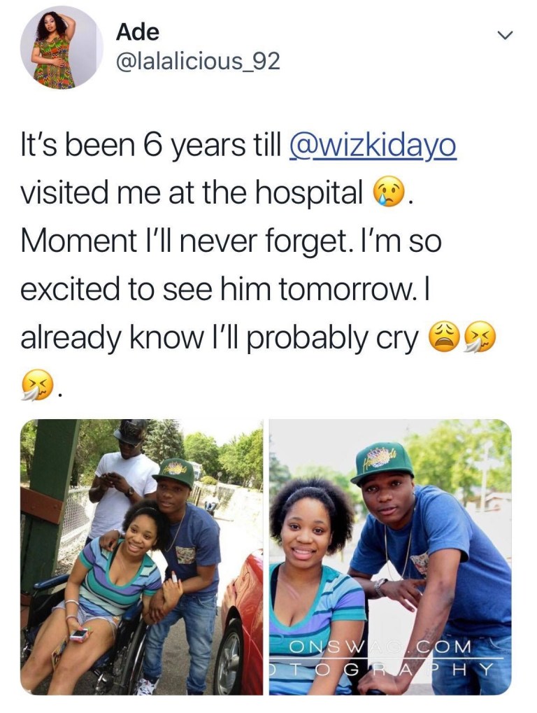 It’s been 6 years till @wizkidayo visited me at the hospital ?. Moment I’ll never forget. I’m so excited to see him tomorrow. I already know I’ll probably cry ???. pic.twitter.com/OLQn3mkixi