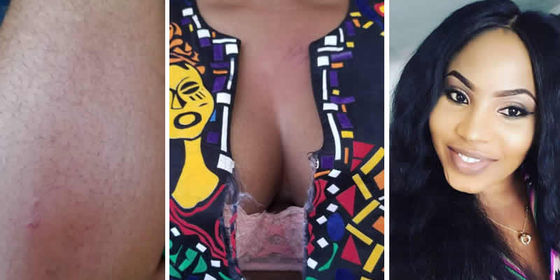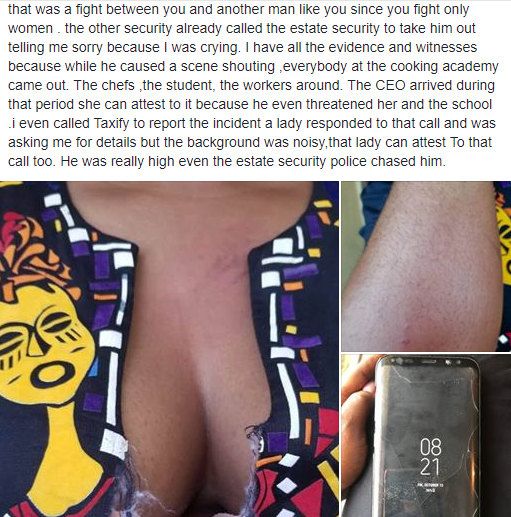 At that time his hands were on my throat as he held on to my dress choking me in the process my dress tore, his nails scratched my chest I screamed by then the security guys were trying to hold him to stop but he had already bruised me seriously my hands my face it was at that point one of the security guys got physical with him .
