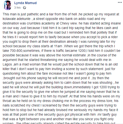 When we got there the trip which I take 700-800,sometimes, if there is traffic became 1200,I told him It couldn’t be possible because it was way above the normal estimate ,in the course of the argument that he started threatening me saying he would deal with me in Lagos ,am a mad woman that he would pull the school down that he is an old killer that I don’t want to pay him inviting a scene by such statement .just for questioning him about the fare increase not like I wasn’t going to pay him ,brought out his phone saying he will record me and post it .,