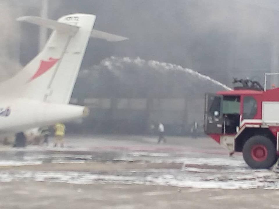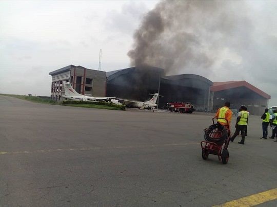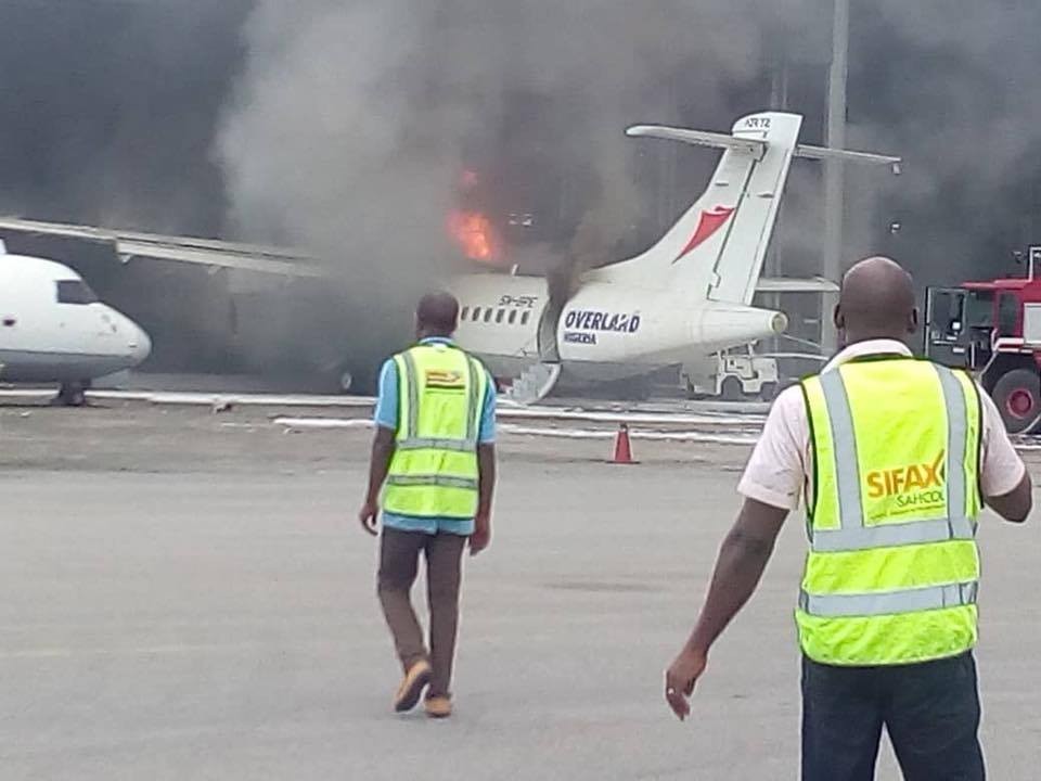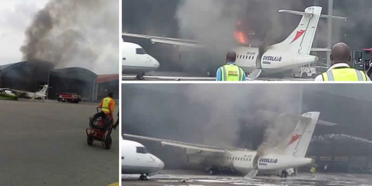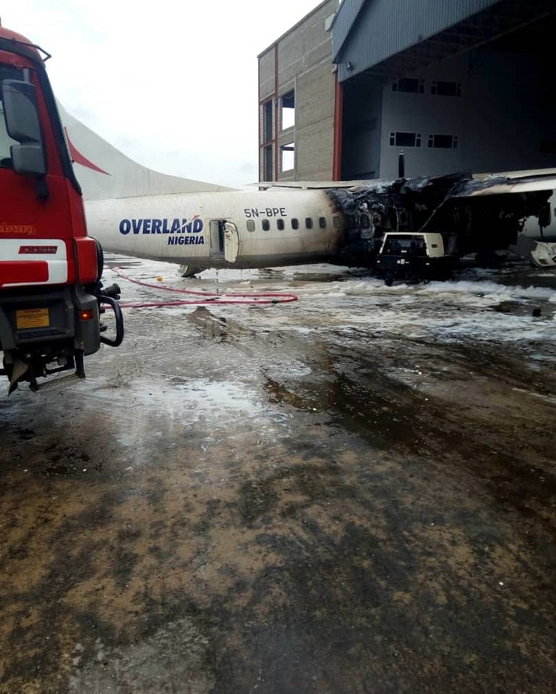An aircraft belonging to Overland Airways, parked inside Overland Air hangar at the domestic wing of the Muritala Muhammed Airport in Lagos, was on fire.