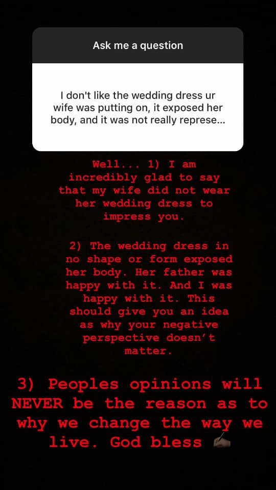“I don’t like the wedding dress your wife was putting on, it exposed her body, it was not representing” the follower complained.