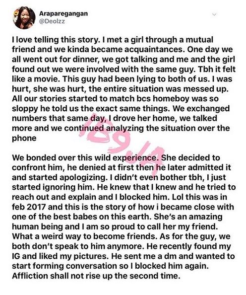 A Nigerian lady @Deolzz on twitter has shared the story of how she became bestfriends with her boyfriend’s other girlfriend.