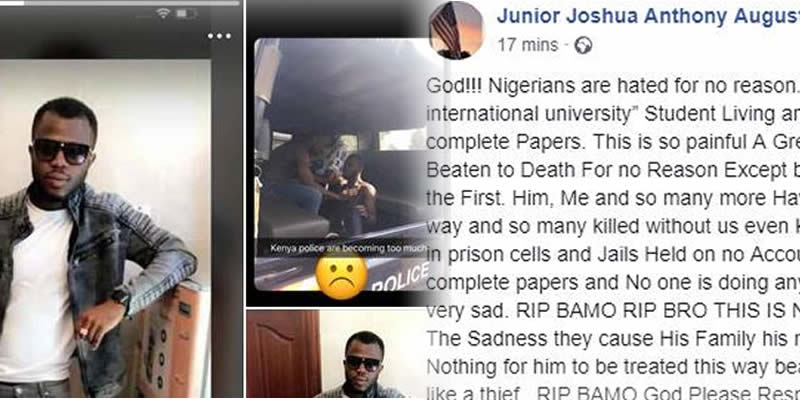 A Nigerian student schooling in Kenya was allegedly beaten to death by Kenyan police. Bamiyo Ashade, popularly known as Bamo, was brutalised yesterday Oct 15th at his house in Four ways estate, Kiambu.