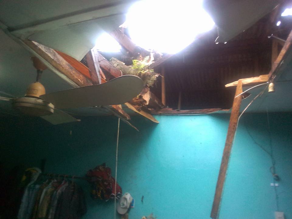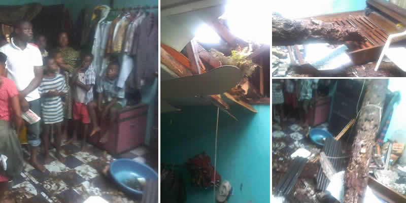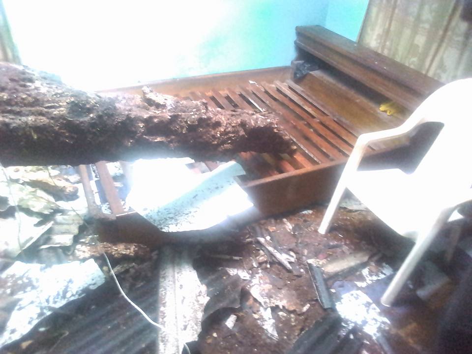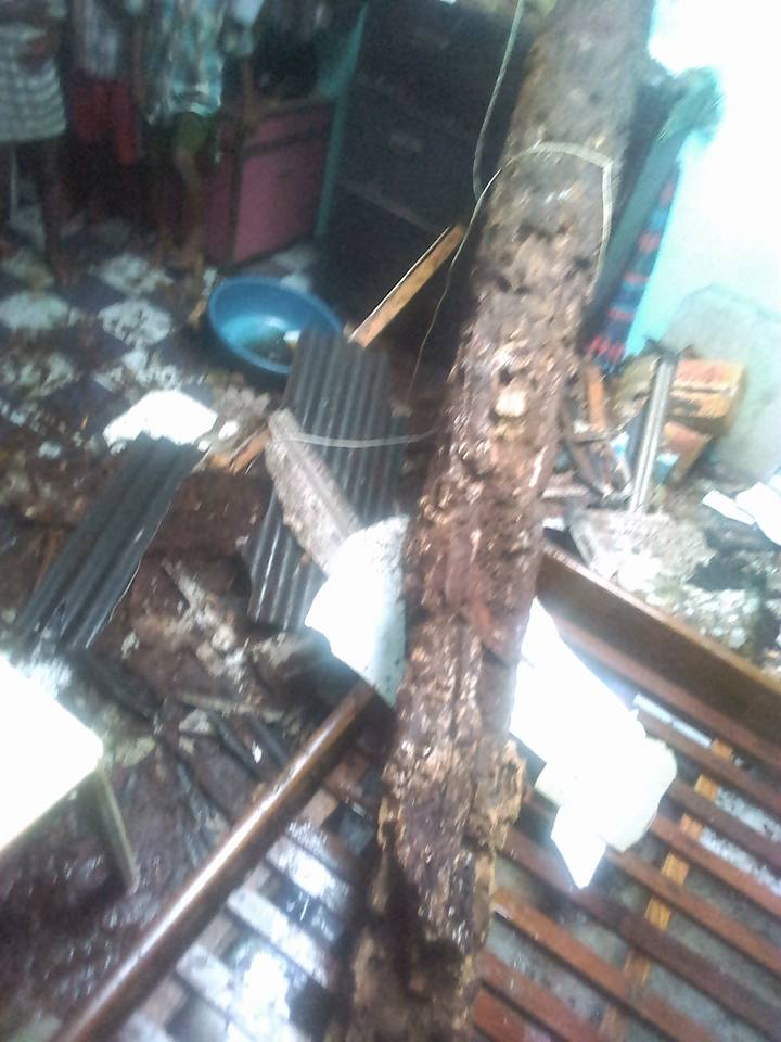 A Cocoanut tree behind his house fell and broke at the top, landed directly to his lying bedroom, fell on the bed while he just got up at the early hours of today th14 Sunday of October, 2018.
