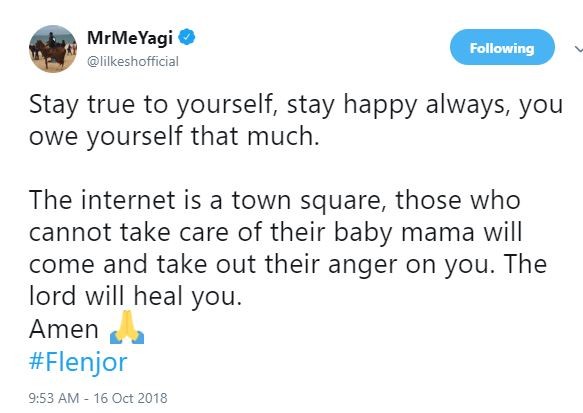 ‘stay true to yourself, stay happy always, you owe yourself that much. The internet is a town square, those who cannot take care of their baby mama will come and take out their anger on you. The lord will heal you’.
