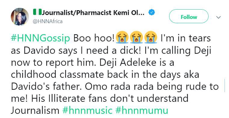 I’m in tears as Davido says I need a dick! I’m calling Deji now to report him. Deji Adeleke is a childhood classmate back in the days aka Davido’s father. Omo rada rada being rude to me! His Illiterate fans don’t understand Journalism #hnnmusic #hnnmumu”