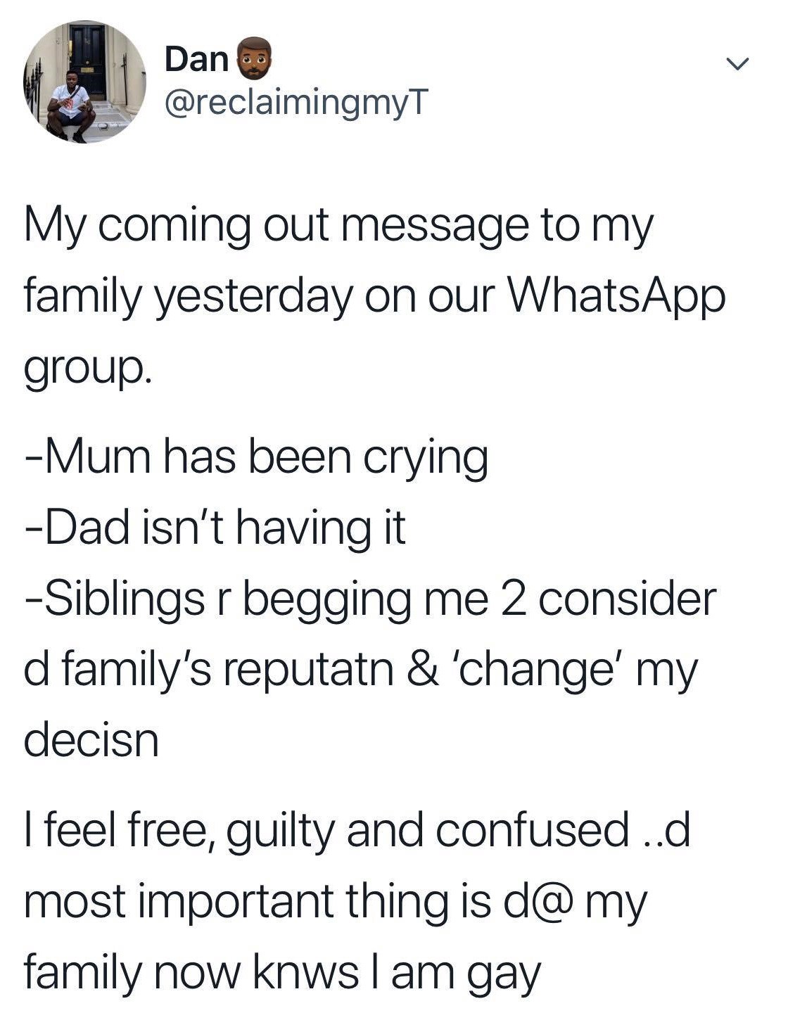 According to him, he feels free, guilty and confused but the most important thing is that his family is now aware he is gay.