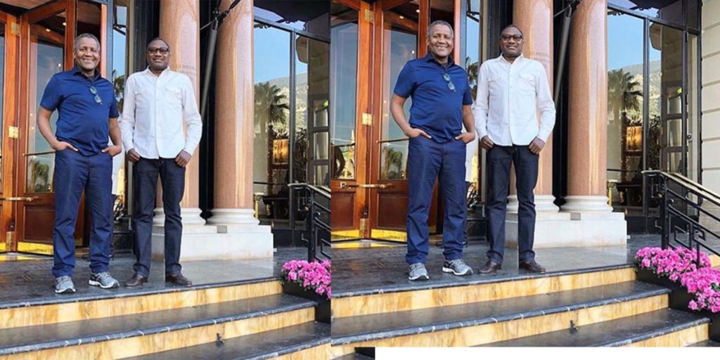 Dangote wore a navy blue T-shirt, jean trousers, and trainers while Otedola had on a white shirt and a pair of jean trousers.