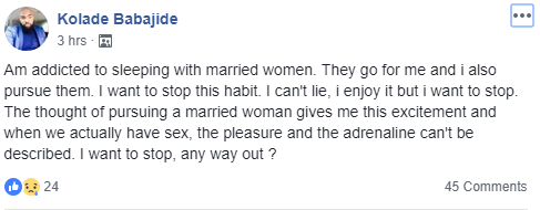Nigerian man addicted to sleeping with married women cries for help. He says he is losing control.