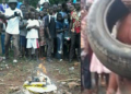An unidentified man was set ablaze by a mob this morning while he was picking up women undies, used pads and used baby pampers at a refuse dump in Naze, Imo state.