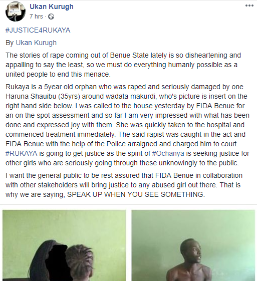 Haruna was caught in the act and the International Federation of Women Lawyers, FIDA, Benue State chapter, with the help of the Police, arraigned and charged him to court.