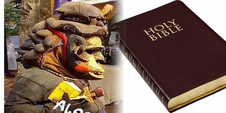 Residents of Agulu, Anambra State were stunned by the scary appearance of a masquerade which had a copy of the Holy Bible and the crucifix in its hands.