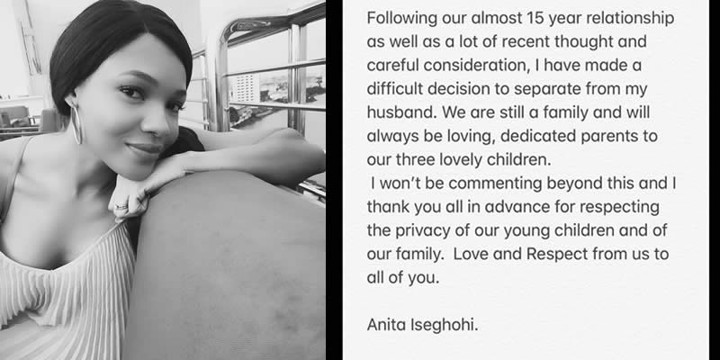Former Most Beautiful Girl in Nigeria (MBGN) and mother of three, Anita Uwagbale-Iseghohi has split from her husband after 11 years of marriage, but 15 years together. She revealed this in a post shared via social media early today.
