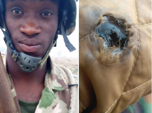 Sammy Jay Ajuwa and other soldiers were being attacked by Boko Haram insurgents when he was shot at. He was struck by a bullet which luckily made a hole in his sweater but lodged there and didn’t enter his body. Sadly, some soldiers weren’t as lucky.