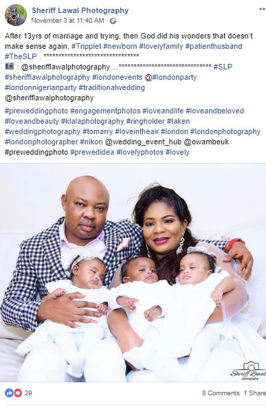 The picture which was shared on Facebook and Instagram under the stable of the photographer who had the good grace of taking the beautiful pictures of the couple and the kids. On his Facebook page, the photographer identified as Sheriff Lawal was all too happy to share the news about the miracle just as he was eager to share the pictures.